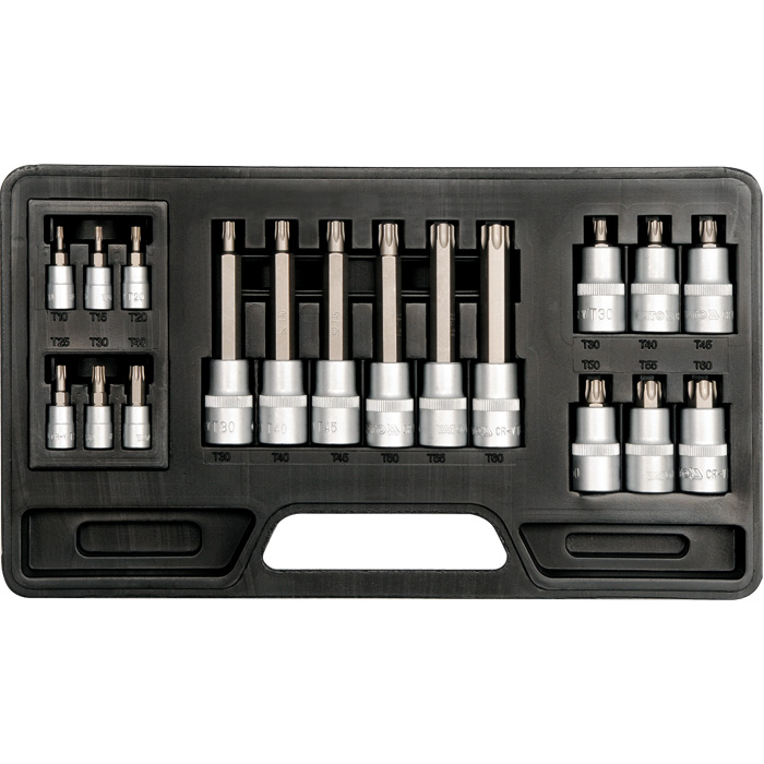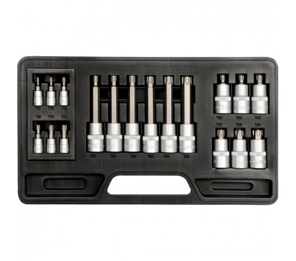 Sản phẩm có 18 chi tiết có các kích cỡ khác nhau :6 đầu mũi vít 1/2": T30, T40, T45, T50, T55, T60 dài 50mm. 6 đầu mũi vít 1/2":T30, T40, T45, T50, T55, T60 dài 100mm. 6 đầu mũi vít 1/4": T10, T15, T20, T25, T30, T40.