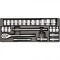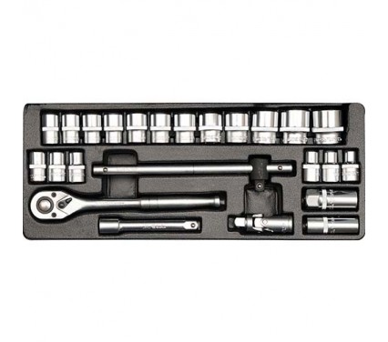 Các chi tiết bao gồm: 18 đầu tuýp loại ngắn, 1 đầu tuýp nối. 1 cần xiết lực, 1 cần trợ lực, 1 đầu tuýp lắc léo, 2 đầu tuýp loại dài