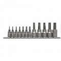 Sản phẩm có 12 chi tiết có các kích cỡ khác nhau 1/4": T8, T10, T15, T20, T25, T27, T30, độ dài 35mm. 3/8": T40, T45, T47, T50, T55 độ dài 50mm
