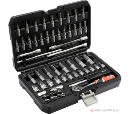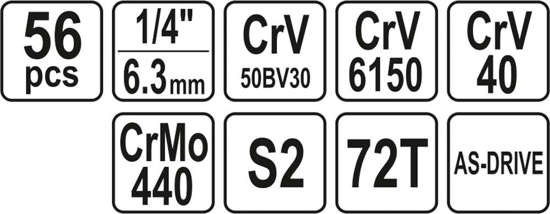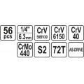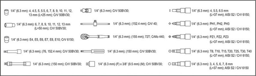 Các chi tiết bao gồm: 12 đầu tuýp loại ngắn 1/4", 8 đầu tuýp loại dài 1/4", 6 đầu tuýp mũi sao 1/4", 2 đầu tuýp nối 1/4", 2 cần xiết lực 1/4", 1 đầu tuýp lắc léo 1/4", 1 tô vít đa năng, 2 cần trợ lực 1/4", 1 tô vít nối dài 1/4", 1 đầu chuyển 1/4' sang 3/8", 3 đầu vít 2 cạnh 1/4", 3 đầu vít 4 cạnh 1/4", 7 đầu vít mũi sao, 8 đầu vít lục giác.